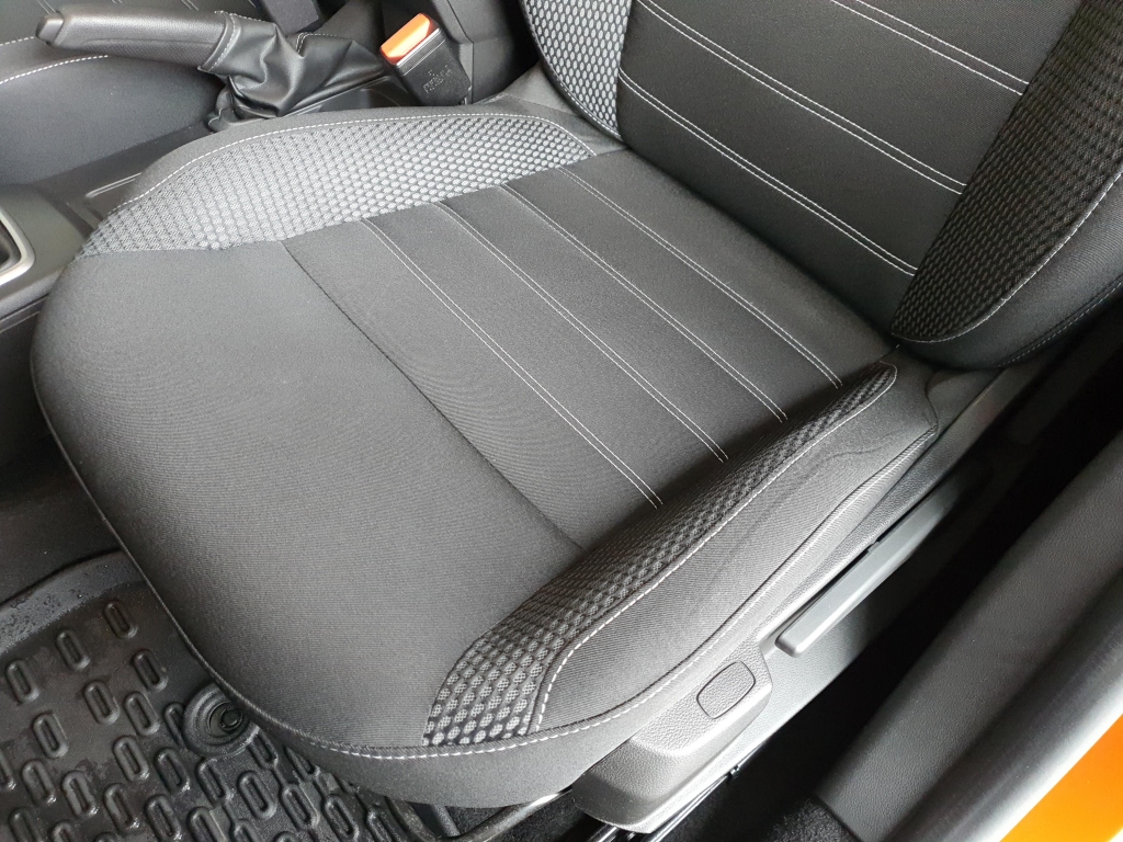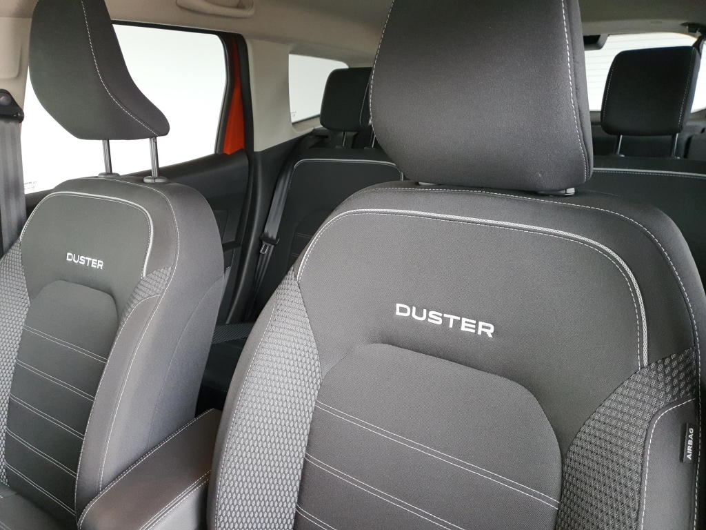 Tapicerka materiałowa w kolorze czarnym z białymi przeszyciami i logiem Duster